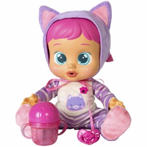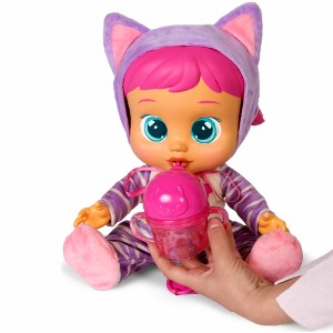 Conoce al Bebé Llorón Katie, es la mayor de los bebés! Es una gatita lindísima y además de su chupete, ¡viene con su biberón! Dale de beber agua con el biberón y ella ¡beberá solita! Cuando este llenita te lo agradecerá, pero si le quitas el biberón cuando aún tiene sed, llorará porque ¡quiere más! ¡Ponle el chupete o dale el biberón para calmarla!