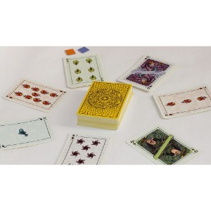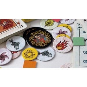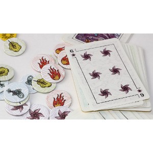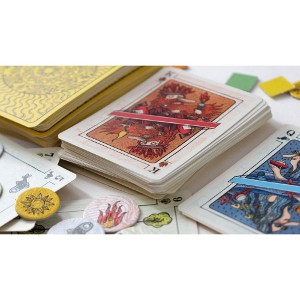 CONTENIDO:2 mazos de 52 cartas / 35 Macas / 8 amuletos / 24 fichas de elementos / 15 monedas / reglamento