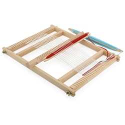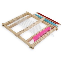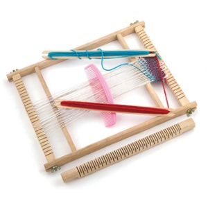 El kit incluye: un marco de telar, un elemento adicional que al girar recoge los hilos alternativamente para ensartar el hilo, y un peine para prensar el fragmento tejido, y dos lanzaderas para desplazar el hilo.